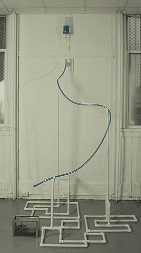 MEDIA: Intravenous hospital bag; dyed water; hose; PVC tubes; aquarium; plant; dirt